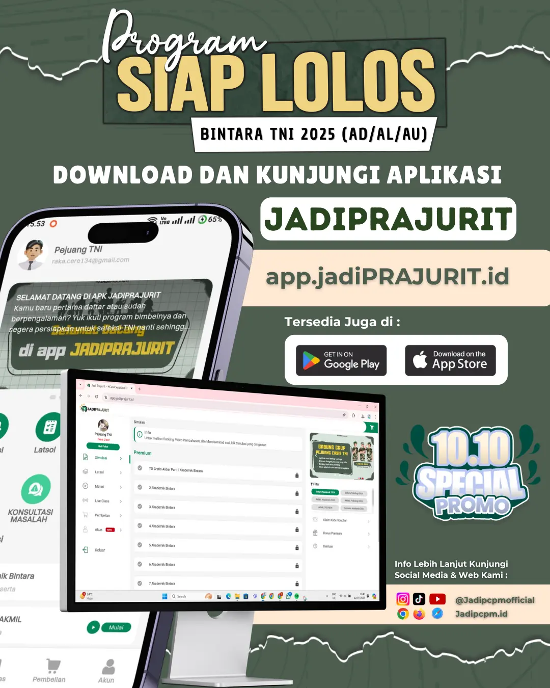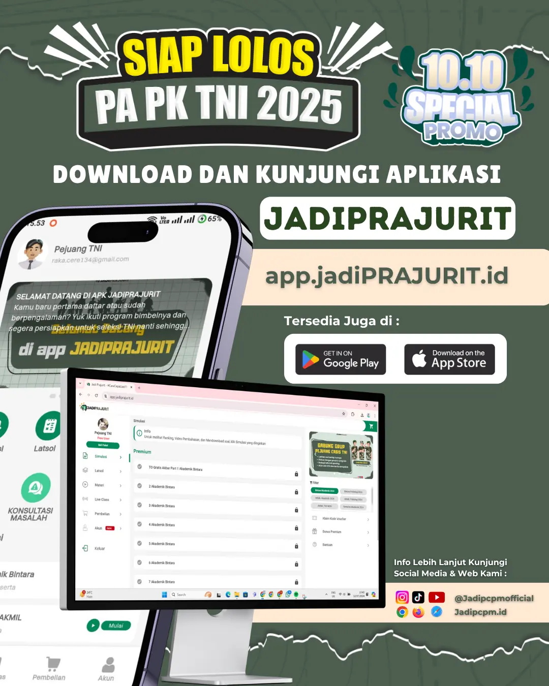 Ayoo Download Aplikasi JadiPrajurit karena banyak sekali yang bisa kamu dapatkan agar kalian CEPAT TERLATIH dengan Soal soal TNI 2025!!!